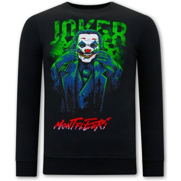 Heren Sweater met Print - Joker - 3762 - Zwart - Specificaties:- Heren Sweater met Print - Joker - Artikelcode:3762-Zwart- Kleur: Zwart- Seizoen: Voorjaar / Najaar- Kraag: Ronde Kraag- Mouwen: Lange Mouw- Patroon: Print, Rhinestone- Kwalitatief: Hoogwaardige Afwerking- Materiaal: 84% Katoen en 16% Lycra- Weefsel: Geweven- Pasvorm: Getailleerd Italiaans- Wasvoorschrift: Handwas, Binnenste buiten wassen (Niet in de droger)- Beschikbare maten: S - M - L - XL - XXL