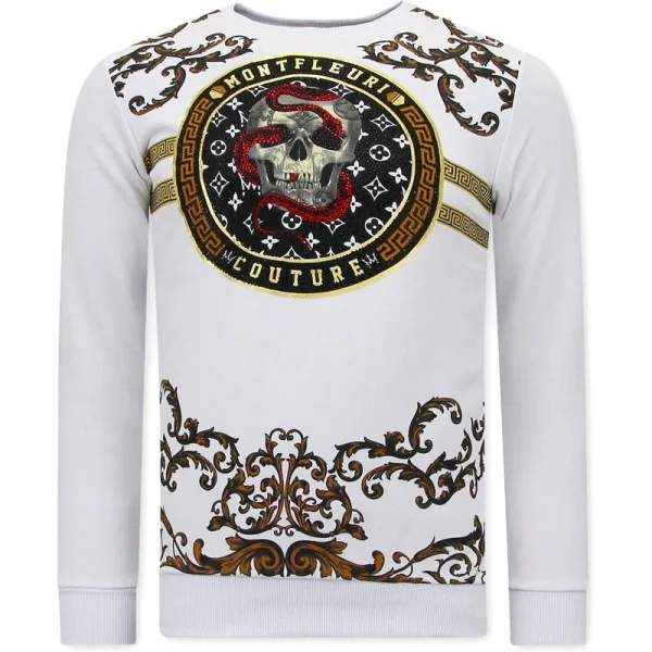 Heren Sweater met Print - Snake Skull - 3674 - Wit - Specificaties:- Heren Sweater met Print - Snake Skull - Artikelcode:3674-Wit- Kleur: Wit- Seizoen: Voorjaar / Najaar- Kraag: Ronde Kraag- Mouwen: Lange Mouw- Patroon: Print, Rhinestone- Kwalitatief: Hoogwaardige Afwerking- Materiaal: 84% Katoen en 16% Lycra- Weefsel: Geweven- Pasvorm: Getailleerd Italiaans- Wasvoorschrift: Handwas, Binnenste buiten wassen (Niet in de droger)- Beschikbare maten: S - M - L - XL - XXL