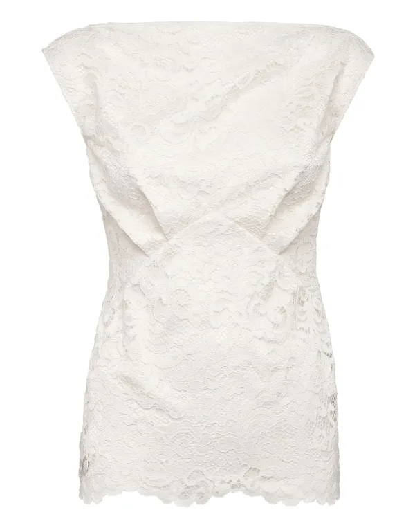 Mouwloze top van kant. Plooien bij de boezem geven volume en worden op hun plaats gehouden door een nauwsluitende peplum. Verborgen ritssluiting middenachter.