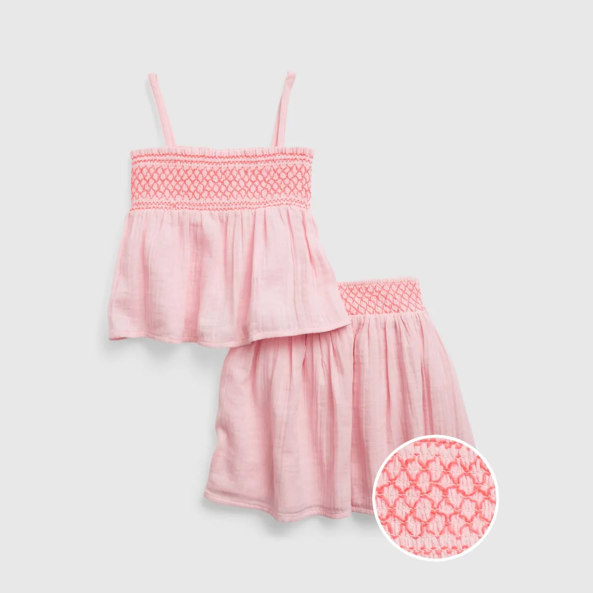 Mädchenset bestehend aus einem Oberteil und einem Rock aus leichtem und atmungsaktivem Stoff, perfekt für wärmere Tage. Das Oberteil verfügt über Spaghettiträger und ein elastisches Raffdesign oben, das für eine bequeme und figurbetonte Passform sorgt. Der Rock verfügt außerdem über einen gerafften elastischen Bund, der für eine anpassungsfähige und bequeme Passform sorgt. Beide Elemente des Sets sind im oberen Bereich mit zarten Stickereien versehen, die für eine feminine und charmante Note sorgen. Es lässt sich ideal mit Sandalen oder Sneakers kombinieren und ist ein vielseitiges Set, das bei jedem lässigen Anlass Komfort und Stil bietet. Komposition: Oberteil: 100 % Baumwolle; Rock: Außenmaterial: 100 % Baumwolle; Innen: 100 % Baumwolle Pflege: - Maschinenwäsche kalt. - Verwenden Sie beim Waschen ähnliche Farben. - Vermeiden Sie die Verwendung von Bleichmitteln. - Bei niedriger Temperatur im Trockner trocknen. - Bei niedriger Temperatur bügeln. - Reinige chemisch nicht.