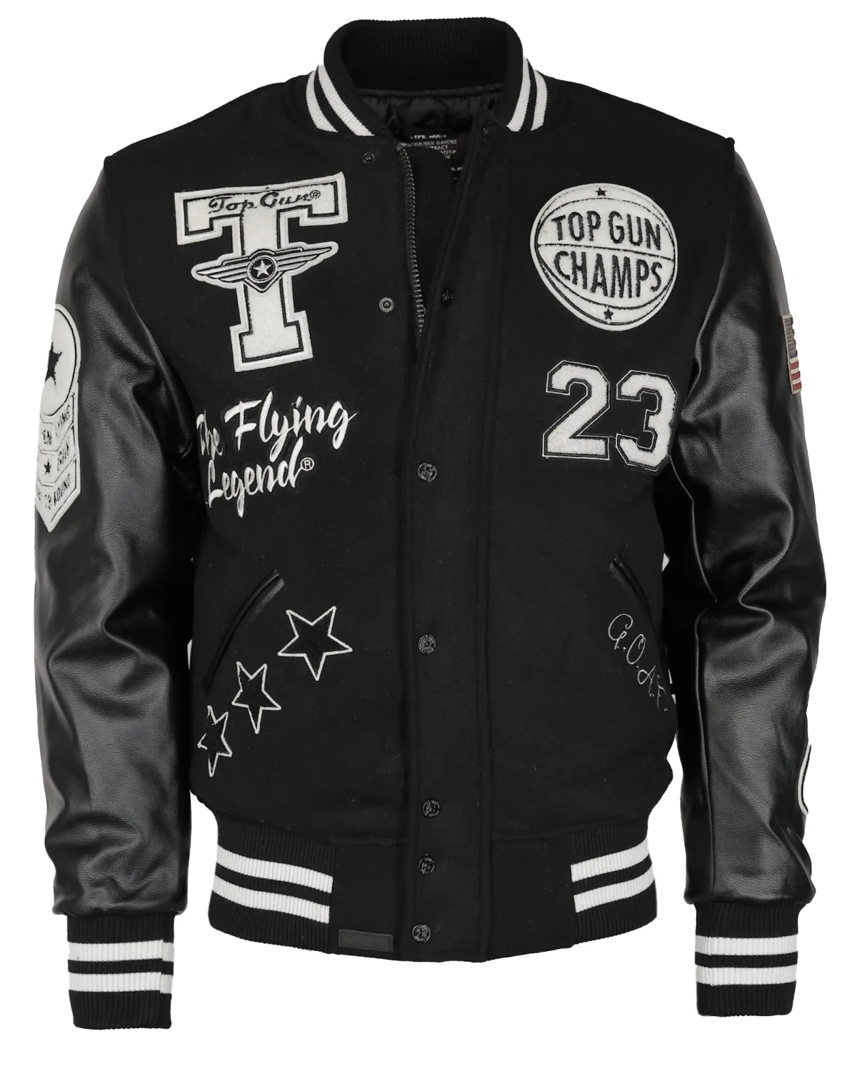 Mit Ärmel in Lederoptik Collegejacke der Marke TopGun mit Ärmel in Lederoptik. Die aufgenähten Patches mit den typischen Top Gun Motiven geben dieser Jacke zusätzliche Ausdruckskraft für einen lässigen Auftritt - mit schönem Bild im Inneren und elastischem Strick an Ärmelabschluss, Bund und Kragen. Die sportliche Jacke besitzt zwei Seitentaschen, zwei Innentaschen und ein großes Motiv auf der Rückseite.