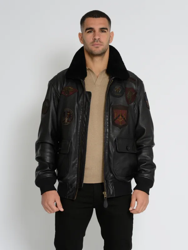 Met lamsleren kraag Originele Top Gun leren blouson in typische pilotenstijl met veel patches. De pasvorm is los en daardoor zeer comfortabel. De afneembare lamsleren kraag maakt de jas zeer veelzijdig.