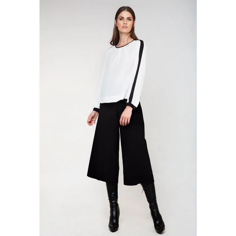 Lange mouwen winter top in crepe polyester stof. Ronde halslijn met een contrastbies. Knoopsluiting aan de achterkant. Contrastbies op de lange mouwen en manchetten. Knoopsluiting op de manchetten. Plooien onder de halslijn. Subtiel A-lijn silhouet. Lengte: 63 cm voor maat 36.
