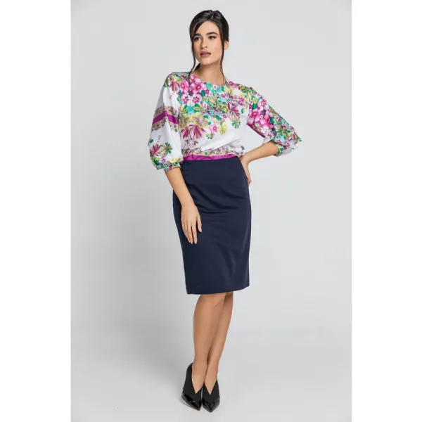 Top met bloemenprint en raglan bisschopsmouwen in ¾ lengte. Ronde halslijn die aan de achterkant sluit met een knoop. Darts bij de buste. Recht silhouet. Ons model is 176cm en draagt maat 36/S. Afmetingen voor maat 36/S (in cm): Schouder -46, Borst-51, Taille-51, Onderkant-51, Mouwlengte -45, Lichaamslengte-59. Accessoires zijn niet inbegrepen. 100% katoen