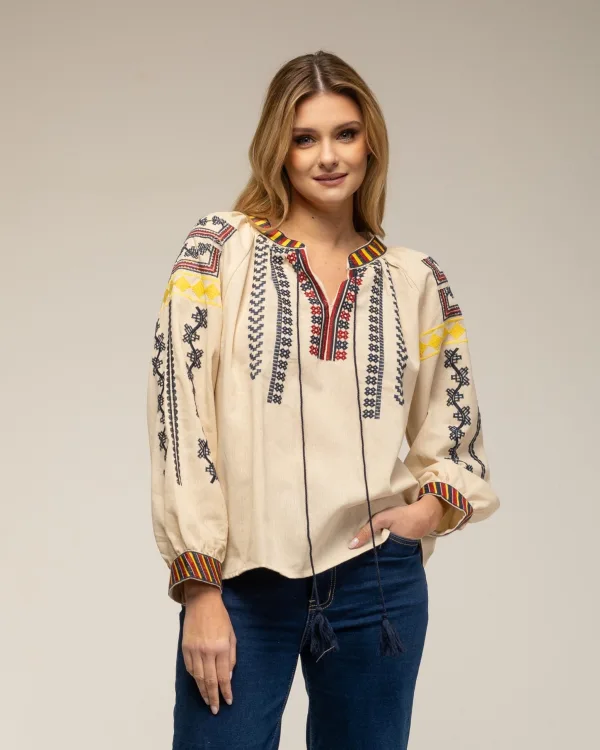 Top met etnisch borduurwerk op mouwen en borst. Geborduurde kraag en manchetten en vetersluiting.