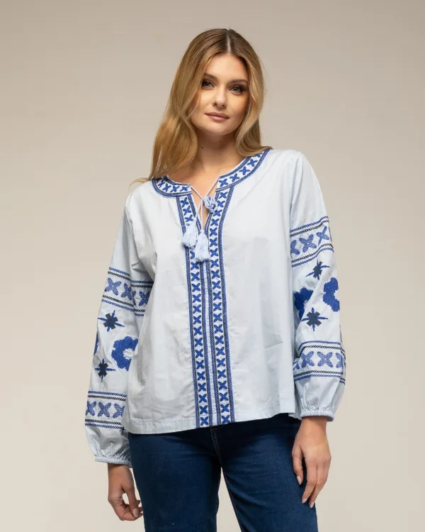 Top met etnisch borduurwerk op de mouwen en kruissteek op de hals en voorkant.