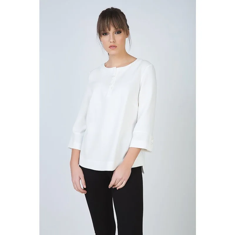 Top van geweven crêpe met een lichte stretch. ¾ mouw met een brede zoom aan de manchetten met 2 decoratieve ecru plastic knopen. Ronde halslijn met een smalle sluiting vooraan in dezelfde stof die sluit met 2 ecru knoopjes in parelmoerstijl. Darts bij de buste voor een perfecte pasvorm. Ongelijke zoomlijn waarbij de achterkant 5cm langer is. Licht A-lijn silhouet. Ons model is 178 cm lang en draagt maat 36. Afmetingen voor maat 38 (in cm):Schouderbreedte-40; Buste-48; Taille-52; Zoomlijn-54; Mouwen-45; Lichaamslengte-61. Kledingstuk is loose fit.