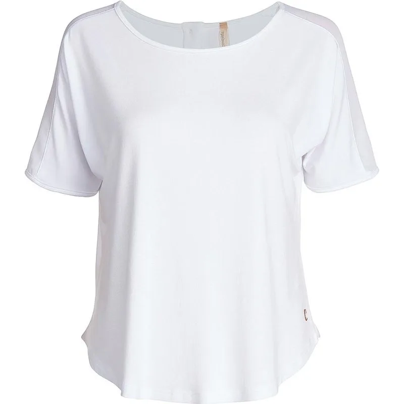 Top CONQUISTA van witte tricotstof. Kapmouwtjes en een ronde halsuitsnijding met biesjes in dezelfde stof aan de halsuitsnijding en de mouwen. Soepele tule op de schouders. Knoopsluiting tot aan de taille op de rug met sierknopen in goudkleur. Afgeronde zoom langer aan de achterkant.