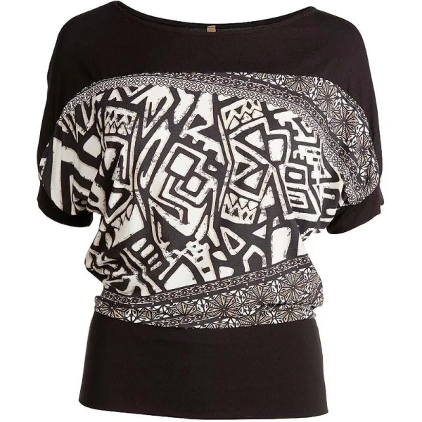 Top CONQUISTA van viscose-elastan. Printstof voor op de borst en effen zwarte stof aan de zoom, boven de borst, op de manchetten en op de rug. Korte mouwen en een boothals. De brede dubbele zoom zorgt voor een lichte golving. Lengte, voor maat 36/S, 64cm. 92% viscose-8% elastan