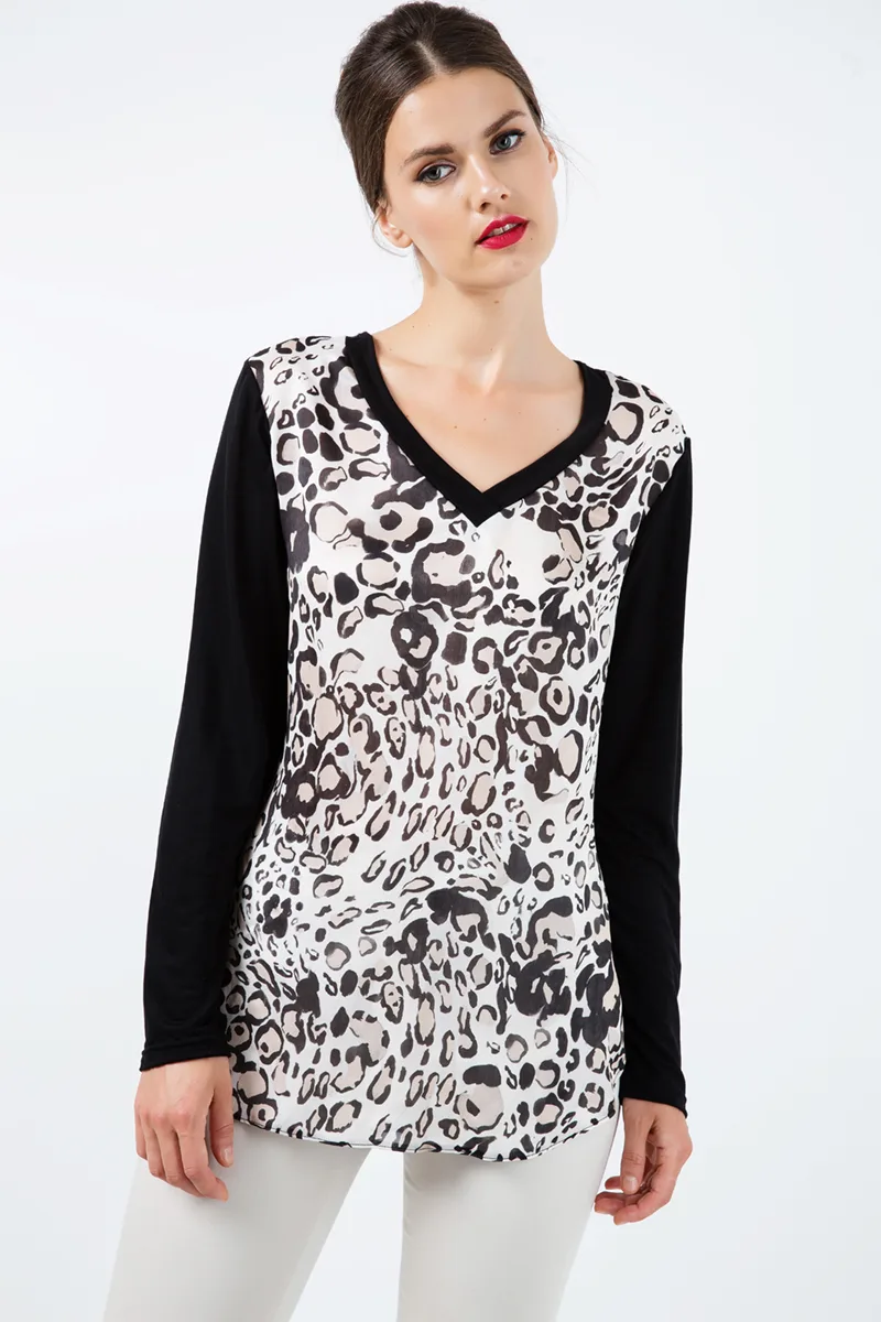 Top met lange mouwen en V-hals. Geweven printstof, 100% viscose-crepe aan de voorkant en over de schouders aan de achterkant (breedte 15cm). Effen zwarte stretch jersey stof, 100% tencel, op de mouwen zwart en halsboord. 1 cm geperforeerde sierrand op de schouders en onder de lengte van de gedessineerde stof op de rug. De voorkant van de top is 10cm korter dan de achterkant. A lijn silhouet.Ons model heeft lengte 178 cm en draagt maat 36. Metingen voor maat 38 (in cm):Buste-52; Lichaamslengte-69; Taille-51; Schouderbreedte-44; Zoomlijn-60; Mouwlengte-61. Kledingstuk is loose fit.