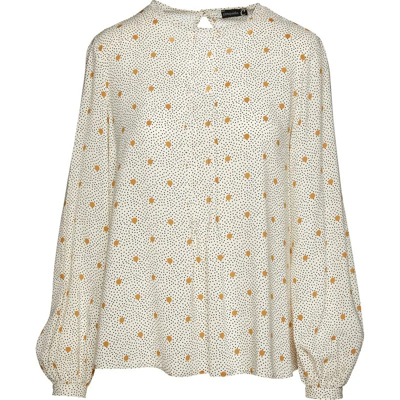 Top van geweven stof met print, 100% viscose. Ronde halslijn. Decoratieve plooien vooraan, 2 links en 2 rechts, die beginnen bij de hals en doorlopen tot in de taille. Lange mouwen met plooien aan het uiteinde. Manchetten van 2 cm breed die worden gesloten met een beige plastic knoop. Sleutelgat opening in de nek met een beige plastic knoop.