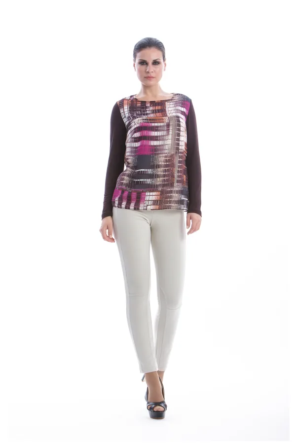 Top van CONQUISTA in print polyesterstof aan de voorkant en effen auberginekleur: viscose-elastaan aan de mouwen en achterkant. Lange mouwen en ronde hals. Recht silhouet. Het model is 1,77 m lang en draagt maat 36/S. 92% viscose, 8% elastaan + 100% polyester.