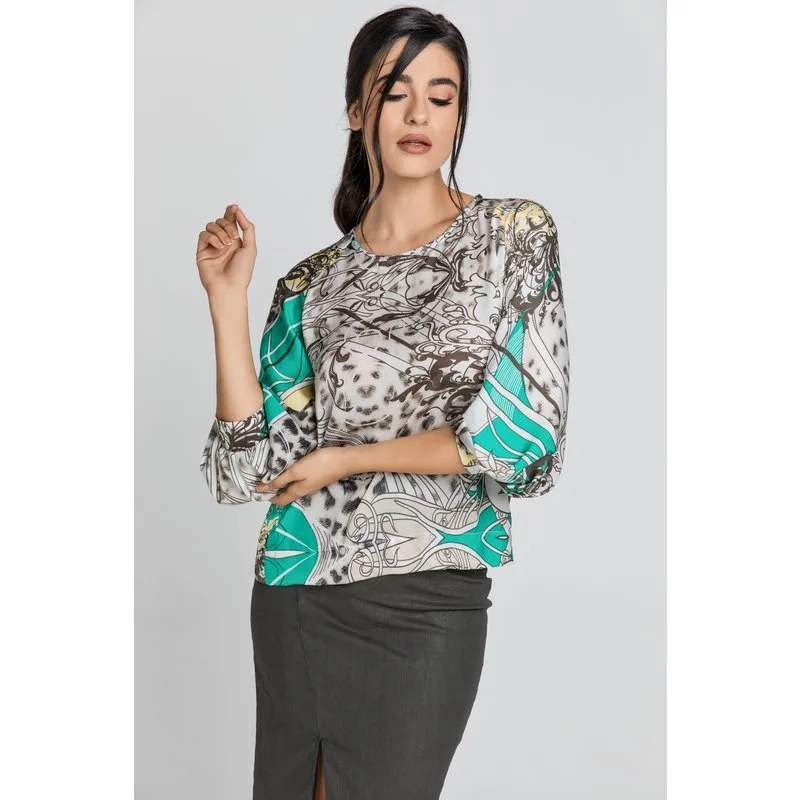 Bedrukte top met raglan bisschopsmouwen van ¾ lengte. Ronde halslijn die aan de achterkant sluit met een knoop. Darts bij de buste. Recht silhouet. Ons model is 176cm en draagt maat 36/S. Afmetingen voor maat 36/S (in cm): Schouder -46, Borst-51, Taille-51, Onderkant-51, Mouwlengte -45, Lichaamslengte-58. Accessoires zijn niet inbegrepen. 100% polyester