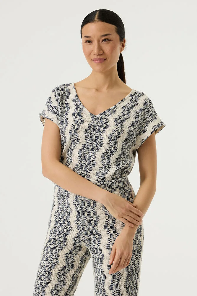 Top met structuur. Deze top heeft een V-hals, korte mouwen en een regular fit. Dit item is gemaakt van 70% katoen, 29% polyester en 1% elastaan. Better Cotton is een initiatief dat zich wereldwijd inzet voor betere omstandigheden in de katoenindustrie.