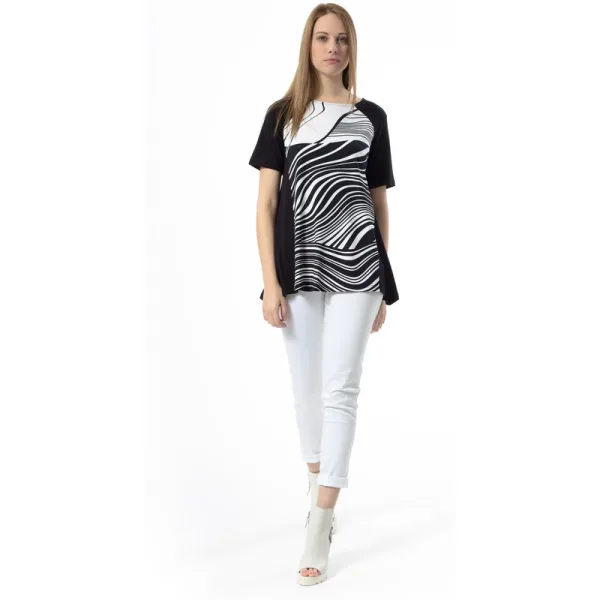 Een print in klassiek zwart en wit wordt naar een hoger niveau getild met deze top met korte mouwen van Conquista. De effen kleur geeft een flatterende definitie aan dit gemakkelijk te dragen stuk. Het getoonde model is 178 cm en draagt maat 36/S.