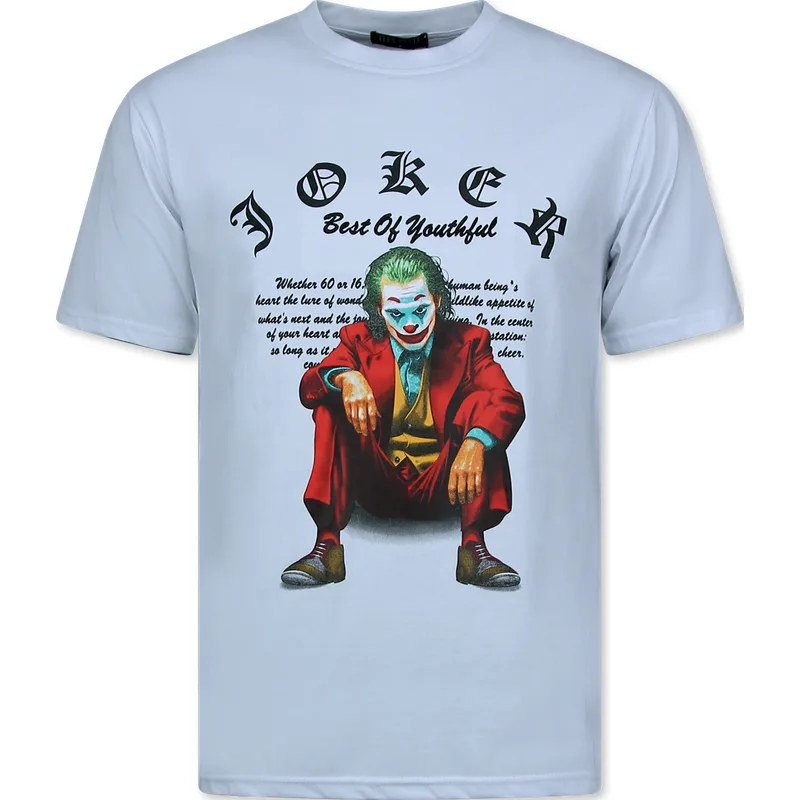 Joker - T shirt Heren met Print - Oversized T shirt Heren - Tshirts Heren Grappig - Funny Shirt - 701 - Wit - Specificaties:- Joker - T shirt Heren met Print - Artikel code: 701 - Wit- Seizoen: Voorjaar / Najaar- Kraag: Ronde hals- Patroon: Print, Geborduurd- Kwalitatief Hoogwaardige Afwerking- Materiaal: 95% Katoen en 5% Lycra- Weefsel: Dik geweven- Pasvorm: Oversized T shirt Here- Mouwen: Korte Mouw- Wasvoorschrift: Binnenste buiten wassen (Niet in de droger)- Beschikbare maten: S - M - L - XL - XXL