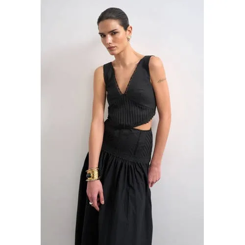 De TOPSHOP Tsalina maxi jurk in zwart katoen is een luchtige zomerjurk met een relaxed A-lijn silhouet. De lange rok valt soepel langs het lichaam en de fijne spaghettibandjes en V-hals geven een open, vrouwelijke halslijn. Gemaakt van 100% katoen voelt de stof licht en ademend aan, ideaal voor warme dagen in de lente en zomer.Zwarte maxi jurk met borduursels Lange maxi jurk met A-lijn pasvorm voor een soepel vallend silhouet Spaghettibandjes en V-hals zorgen voor een open bovenkant Effen zwarte kleur met subtiele borduursels voor extra detail Geweven katoen dat zacht aanvoelt op de huid en geschikt is voor zonnige dagen Open details geven een luchtige uitstraling Zonder sluiting, de jurk trek je eenvoudig over het hoofd aan Zonder zakken voor een rustige, strakke look rondom de heupen Maatadvies: dit artikel valt normaal Wasvoorschrift: handwas, niet strijken en niet drogen in de droogtrommelMaxi jurk voor zonnige momentenDeze jurk past goed op ontspannen zomerdagen, een terrasafspraak of een lichte avondwandeling. Combineer met sandalen en een lichte cardigan voor frisse momenten, of draag de jurk solo met minimalistische sieraden als het echt warm is.Het modische karakter van TOPSHOPTOPSHOP staat bekend om eigentijdse mode met een toegankelijke stijl. De collecties volgen de trends en blijven toch draagbaar voor elke dag. Met deze Tsalina maxi jurk haal je een kledingstuk in huis dat past bij het karakter van het merk, met oog voor detail en comfortabele pasvorm.Een lange zwarte zomerjurk waar je keer op keer gemakkelijk naar grijpt zodra de zon zich laat zien.