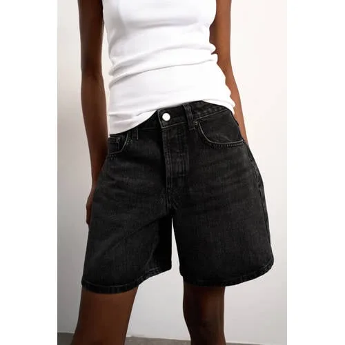 Voor een relaxte look met een stoere twist is deze TOPSHOP denim short in black denim een veelzijdige basic voor je garderobe. De hoge taille en losse pasvorm geven een comfortabel gevoel en een moderne uitstraling, perfect voor zonnige dagen in de stad of een festival. Gemaakt van 100 procent katoen voelt de short stevig aan en vormt de stof zich mooi naar je lichaam.Zwarte high waist short met loose fit Kleur black denim, makkelijk te combineren met T-shirt, top of blouse Hoge taille die je silhouet benadrukt en prettig aansluit Loose fit pijpen voor een ontspannen, luchtig gevoel Gemaakt van 100 procent katoen voor een stevige, niet rekbare denimkwaliteit Rits- en knoopsluiting aan de voorkant 5-pocket model met twee achterzakken, twee steekzakken en een muntzakje Korte lengte, ideaal voor lente en warme zomerdagen Maatadvies: dit artikel valt normaalCasual styling voor elke dagDeze korte denim broek past goed bij een basic wit T-shirt en sneakers voor een eenvoudige dagelijkse look. Voor een avond op het terras combineer je de short met een luchtige blouse en sandalen. De effen zwarte wassing maakt het eenvoudig om je outfit aan te passen aan het moment.TOPSHOP, trendgericht en toegankelijkTOPSHOP staat bekend om modieuze items die aansluiten op de nieuwste trends. De ontwerpen zijn eigentijds, draagbaar en afgestemd op het dagelijkse leven. Zo haal je met deze short een betrouwbaar kledingstuk in huis dat je seizoen na seizoen uit de kast pakt.Een comfortabele denim short die je eenvoudig stylet van casual daglook tot avondoutfit.