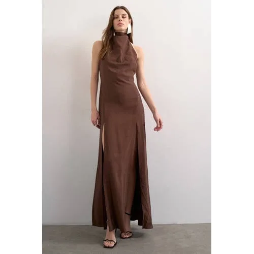 De TOPSHOP halternek maxi jurk in donkerbruin is een veelzijdige keuze voor avonden uit, feestjes of een diner. De lange, soepel vallende pasvorm, de halterkraag en het mouwloze design geven een verfijnde en vrouwelijke look. De effen kleur maakt het eenvoudig om te combineren met verschillende sieraden en schoenen.Kenmerken van de donkerbruine halternek jurk Lange maxi lengte met split voor extra bewegingsvrijheid en een elegante lijn Halterkraag en mouwloos model, waardoor schouders en hals mooi uitkomen Effen donkerbruine kleur, makkelijk te stylen met zowel subtiele als opvallende accessoires Gemaakt van modal, een zachte stof die prettig aanvoelt op de huid en mooi langs het lichaam valt Geen zakken voor een glad silhouet zonder onderbrekingen Maatadvies: valt normaal, waardoor je je gebruikelijke maat kunt aanhoudenVoor avondjes uit en speciale momentenDeze lange jurk leent zich goed voor gelegenheden waarbij je verzorgd voor de dag wilt komen zonder dat het ingewikkeld wordt. De maxi lengte en halternek maken de jurk geschikt voor zowel feestelijke avonden als meer ontspannen momenten.TOPSHOP: eigentijdse mode met aandacht voor detailTOPSHOP staat bekend om moderne, draagbare collecties met een duidelijke modische signatuur. De ontwerpen volgen de trends, maar blijven tegelijk toegankelijk voor dagelijks gebruik. Wie kiest voor TOPSHOP, kiest voor mode die inspeelt op het leven van nu.Een lange halterjurk die je garderobe een doordachte en tijdloze toevoeging geeft.