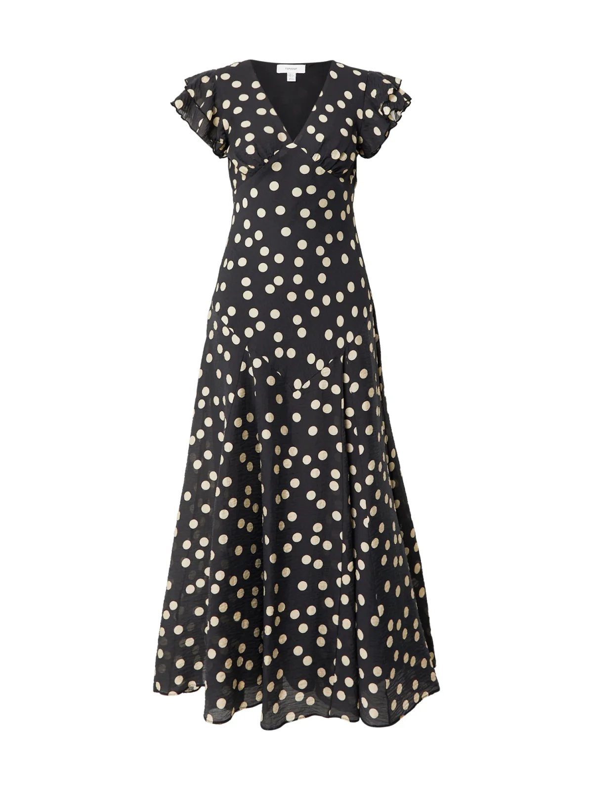 Design: Gevoerde zoom/rand, Diepe snit/decolleté; Materiaal: Lyocell; Halstype: V-hals; Motief: Gestippeld; Details: Volant, Gedrapeerd; Extra's: All-over patroon, Gladde stof; Lengte: 7/8 lengte; Snit: Getailleerd; Pasvorm: Normale pasvorm; Armlengte: Kwartmouw