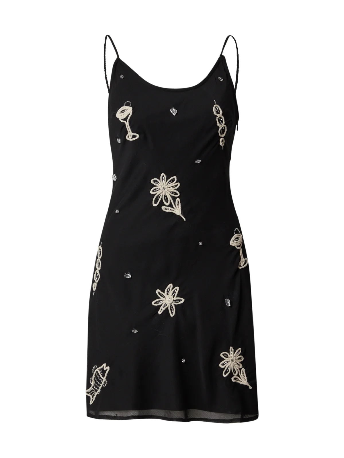 Design: Gevoerde zoom/rand, Rechte zoom; Halstype: Ronde hals; Soort bandjes: Spaghettibandjes; Details: Borduursels, Sierstenen; Extra's: Met halfedelstenen, All-over patroon, Op staal naden; Lengte: Kort/mini; Snit: Getailleerd; Pasvorm: Normale pasvorm; Armlengte: Mouwloos