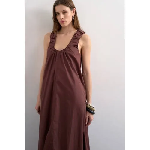 Deze TOPSHOP lange bruine maxi jurk van katoen is een rustige, moderne basis voor je voorjaars- en zomergarderobe. De jurk heeft een lange lengte, een aangesloten col en een mouwloos ontwerp. De effen bruine kleur maakt combineren eenvoudig, terwijl de geweven stof stevig aanvoelt en mooi recht langs het lichaam valt. Gemaakt van 100% katoen, waardoor de stof prettig ademt op warmere dagen. Volgens het maatadvies valt deze jurk normaal.Kenmerken van de Tsruni Sl Maxi Dress Wvn Maxi lengte, ideaal als zomerse jurk met meer bedekking Mouwloos model, geeft ruimte en bewegingsvrijheid bij de armen Aangesloten colkraag voor een moderne, iets stoerdere uitstraling Effen bruine kleur, makkelijk te combineren met sandalen of sneakers Gemaakt van 100% katoen, voelt zacht aan en is geschikt voor dagelijks dragen Geweven stof die vormvast blijft en netjes oogt Zonder sluiting, je trekt de jurk eenvoudig over het hoofd aan Wasbaar op 40 graden en warm strijkbaar, niet geschikt voor de droogtrommel Valt volgens het maatadvies normaal, kies je gebruikelijke maatVoor lente, zomer en laagjesdagenDeze maxi jurk uit de Rebel collectie leent zich goed voor warme dagen, gecombineerd met slippers of sandalen. Op koelere momenten draag je er eenvoudig een denim jasje of een los vest overheen. De lange lengte zorgt voor een rustige look, terwijl de col net wat extra karakter geeft.TOPSHOP, eigentijdse damesmodeTOPSHOP staat bekend om mode die aansluit op de laatste trends, maar wel draagbaar blijft in het dagelijks leven. De collecties zijn ontworpen met aandacht voor pasvorm en details, zodat je kleding kiest waar je je gemakkelijk in voelt en die je vaak uit de kast pakt.Een lange, katoenen jurk die je makkelijk meeneemt van een gewone werkdag naar een ontspannen avond.