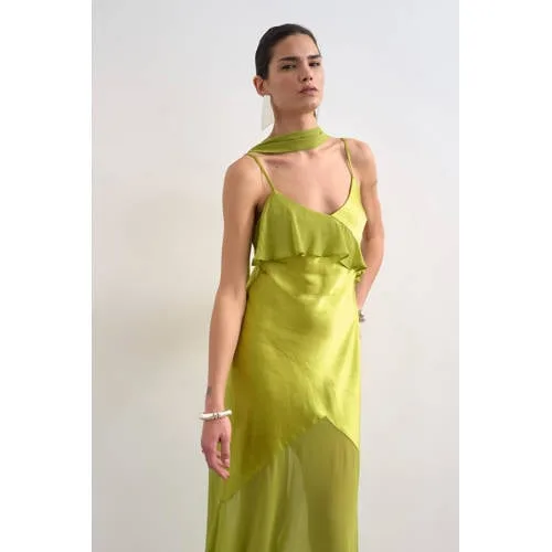 Geef je outfit een verzorgd accent met de TOPSHOP Tsannika maxi jurk in groen. Deze lange jurk in een frisse groentint heeft een rustige, chique uitstraling door de soepel vallende, satijnachtige stof. De A-lijn pasvorm volgt subtiel je silhouet, terwijl de spaghettibandjes en de sjaalkraag samen zorgen voor een verfijnd bovenstuk. De volantdetails geven extra beweging bij elke stap, geschikt voor een avondje uit of een feestelijke gelegenheid.Maxi jurk met speelse volants Lange maxi lengte voor een elegante, vloeiende look Spaghettibandjes en sjaalkraag voor een verfijnde halslijn Effen groene kleur die goed te combineren is met sieraden en hakken Semi-transparante details voor een subtiel lichte uitstraling Volant afwerking die zorgt voor extra beweging Blinde ritssluiting aan de achterzijde voor een strak en rustig silhouet A-lijn model dat het silhouet zacht volgt Maatadvies: valt normaal, praktisch als je twijfelt tussen maten Geschikt als avondjurk, zomerjurk en voor speciale gelegenhedenIdeaal voor feestjes, diners en bruiloftenDeze maxi jurk past goed bij gelegenheden waarbij je net iets meer uitstraling wilt, zonder dat het te uitbundig wordt. Combineer met hakken en een kleine clutch voor een bruiloft of chic diner, of kies voor sandalen en een fijn vestje tijdens een zomerse avond. Door de handwas en het advies om niet te strijken en niet in de droogtrommel te drogen, blijft de stof soepel en glanzend.TOPSHOP stijl met een eigen karakterTOPSHOP staat bekend om mode die inspeelt op de trends en tegelijk draagbaar blijft in het dagelijks leven. De Tsannika jurk sluit daar goed op aan, met een eigentijds ontwerp en doordachte details. Je kiest voor een kledingstuk dat is ontworpen met aandacht voor pasvorm, kleur en een moderne, vrouwelijke uitstraling.Een lange groene jurk die net dat beetje extra flair geeft aan jouw moment.