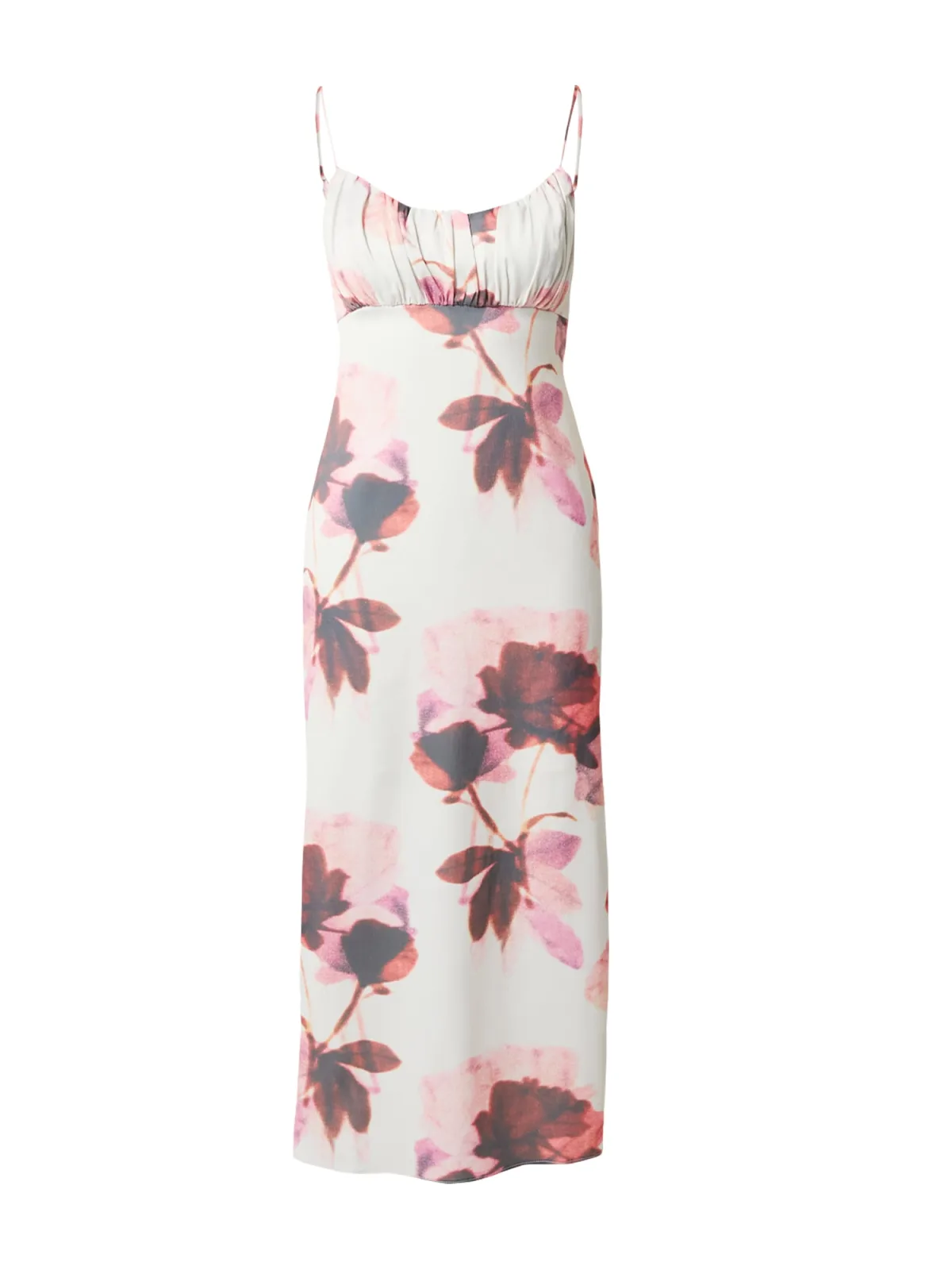 Design: Gevoerde zoom/rand, Rechte zoom, Overige kragen, Uitgesneden rug; Materiaal: Satijn; Halstype: Ronde hals; Motief: Bloemenprint; Soort bandjes: Spaghettibandjes; Details: Cut-outs, Gedrapeerd; Extra's: Verstelbare bandjes, All-over patroon, Gladde stof; Lengte: 3/4 lengte; Pasvorm: Slanke pasvorm; Armlengte: Mouwloos