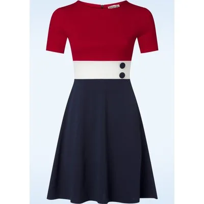 ''Life is short.. buy the dress!'' Deze vintage geïnspireerde beauty heeft een hoge ronde halslijn, korte mouwtjes, decoratieve knoopjes aan de voorzijde en loopt vanaf de taille uit in een semi-swing rok. Ze is uitgevoerd in een stevige maar soepele en stretchy, crêpe achtige stof in de kleuren rood, wit en blauw, die heerlijk comfortabel draagt. * Semi-swing model * Ronde halslijn * Korte mouwen * Decoratieve knopen voorzijde * Blinde rits achterzijde * Exclusief bij Topvintage verkrijgbaar * Reikt bij een lengte van 1,70 m net boven de knie