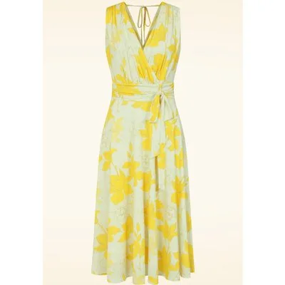 “Light, bright, and made for sunny days.” Wanneer je Jane aantrekt, weet je het meteen: ze is perfect voor de zomer! Ze is uitgevoerd in een gladde, soepele, licht glanzende en stretchy slinky stof met een mintgroene achtergrond en een prachtige print van gele lelies. Bovendien staat ze garant voor heerlijk kreukvrij draagplezier. * Zwierig model * Geheel gevoerd * Vaste strikbandjes * Geen rits of knopen; aantrekken en ready to go! * Valt bij een lengte van 1,70 m tot halverwege de kuit * Exclusief bij Topvintage verkrijgbaar