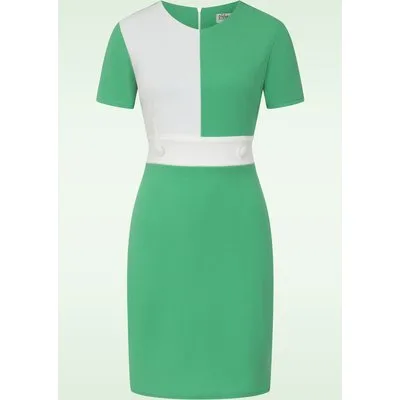 “Where fresh colour meets effortless twirl.” Deze A-lijn jurk heeft een hoge halslijn, korte mouwtjes, sierknopen en is uitgevoerd in een stretchy en crêpe achtige stof in wit en groen. * A-lijn model * Korte mouwtjes * Gevoerde top * Decoratieve knopen * Blinde rits achterzijde * Exclusief bij Topvintage verkrijgbaar * Valt bij een lengte van 1.70 m boven de knie