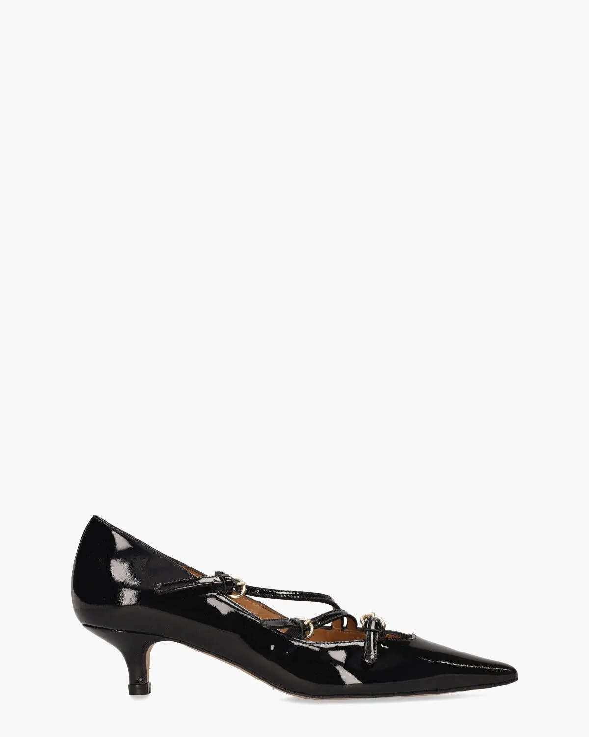 Pumps voor dames Cinthia uit de collectie van het Spaanse merk Toral. Deze schoenen hebben een bovenwerk van zwart lakleer. Het puntige neusje en de bandjes met gouden gespjes over de wreef zorgen voor een chique retrolook. De binnenkant is in leer en suède uitgevoerd. Het hakje, ook omhuld met lakleer, heeft een hoogte van circa 4 cm. De