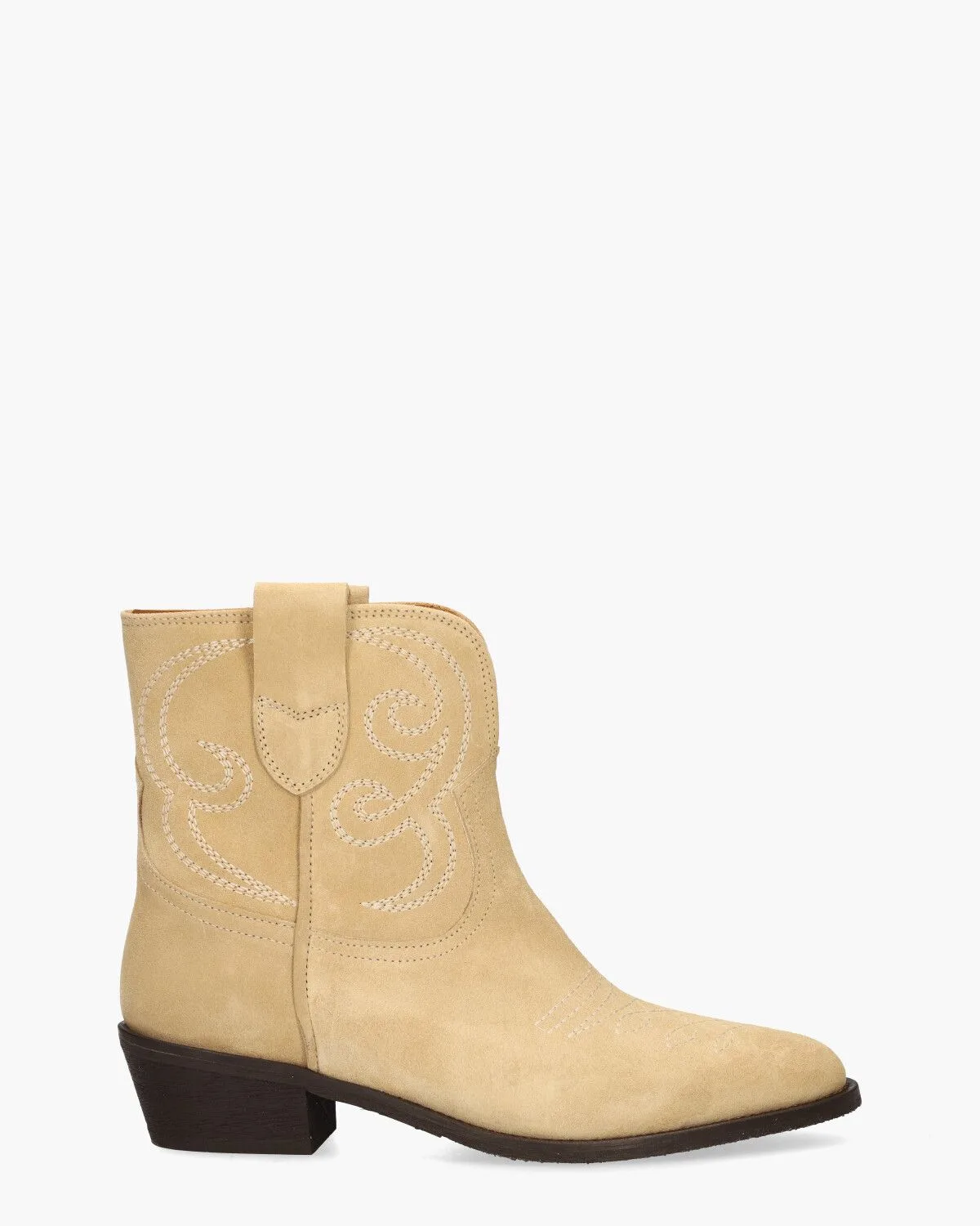 Dames enkelboots Puja van het Spaanse merk Toral. Deze laarsjes in Cowboy-model zijn gemaakt van licht vintage geschuurd lichtbruin suède, met prachtige stitching als opvallend accent. De binnenkant is uitgevoerd in leer, terwijl het vaste lederen voetbed zorgt voor comfort, de hele dag door. Met een schachthoogte van ongeveer 15 cm en een