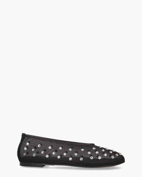 Deze zwarte ballerina's Sybilla van het Spaanse merk Toral combineren elegantie met een moderne twist. Het bovenwerk is gemaakt van zwart mesh voorzien van all-over kristalletjes en afgewerkt met zwart leer. De voering is in stof met een vast voetbed uitgevoerd. De ronde leest geeft dit model een klassieke ballerinalook, terwijl het lage