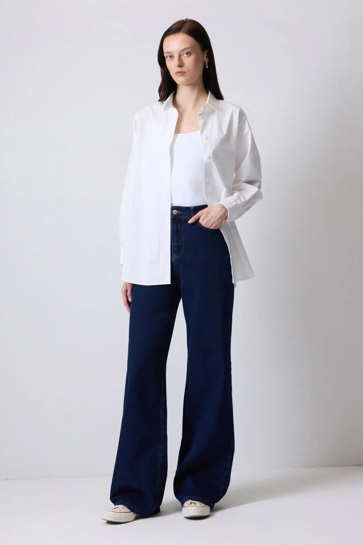 Design: Ritssluiting, 5-pocket-style; Type sluiting: Ritssluiting; Materiaal: Denim; Motief: Effen; Extra's: Contrasterende naden, Riemlussen; Wassing: Rinsed/dark washed; Lengte: Lang/maxi; Pasvorm: Wide leg; Taillehoogte: High waist