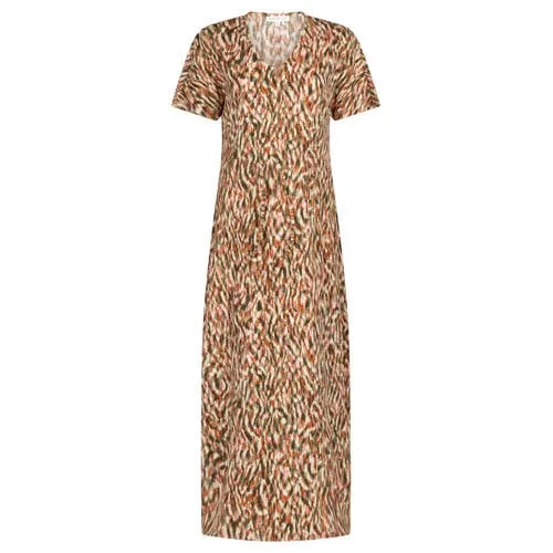 Met deze Tramontana maxi jurk met korte mouw geef je je dagelijkse look in één keer meer uitstraling. De jurk heeft een lange lengte en een multi kleur die direct opvalt, zonder druk te ogen. De V-hals zorgt voor een open halslijn en door de trekkoorden in de taille creëer je eenvoudig een silhouet dat mooi aansluit op je figuur. De soepele, gebreide stof voelt zacht aan en beweegt comfortabel met je mee.Details die het verschil maken Lange jurk met korte mouwen, ideaal voor het voor- en najaar en zomerse dagen Multi kleur dessin voor een levendige maar toch rustige uitstraling V-hals die mooi langs de hals valt en ruimte laat voor een ketting Trekkoorden in de taille voor een verstelbare pasvorm Soepel vallende tricotkwaliteit met 2% elastaan voor lichte stretch Wasbaar op 30 graden en lauw strijkbaar (1 punt) voor makkelijk onderhoud Niet drogen in de droogtrommel om de vorm en kleur langer mooi te houdenVeelzijdig van werk tot weekendDeze lange jurk is geschikt voor verschillende momenten. Combineer met sneakers en een denim jack voor een casual dag, of draag sandalen en subtiele sieraden als je net iets gekleder voor de dag wilt komen. De lengte en het dessin maken de jurk geschikt voor zowel kantoor als een etentje.Tramontana: herkenbare stijl met aandacht voor detailTramontana maakt kleding met aandacht voor pasvorm, print en kleur. De collectie speelt in op actuele trends, maar blijft goed draagbaar in het dagelijks leven. Met deze jurk haal je een ontwerp in huis dat stijl en draaggemak combineert.Een comfortabele maxi jurk die je zo aantrekt en waar je de hele dag fijn in beweegt.