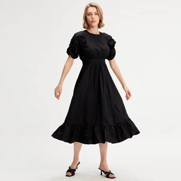 Eenvoudig en sculpturaal stuk, deze jurk benadrukt je taille en schouders met een verzameld volume. Een royale wijd uitlopende vorm versierd met een brede ruche op het rokgedeelte. Voor elk informeel uitje, op kantoor of op vakantie. Productdetails • Vorm: gebogen en trapezoid • Lengte: 122 cm • Ronde halslijn • Invisible Zipper Center Back