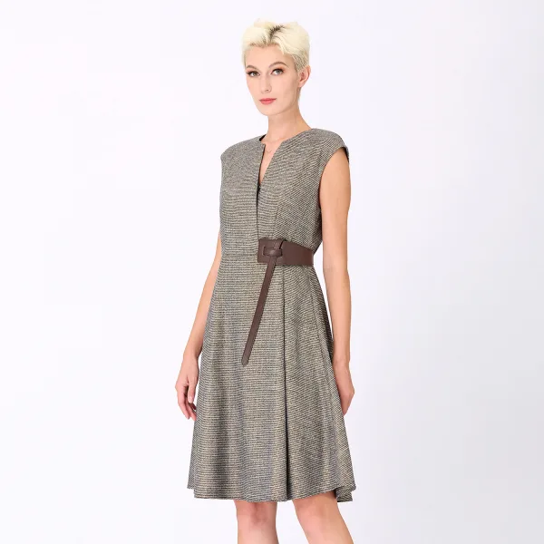 Een snit die het silhouet benadrukt: gemonteerde taille, groot uitlopende volume, v -halslijn met wrap -effect. Om te worden uitgezonden met een riem die op een conventionele manier kan worden geplaatst of in een grote lus aan de rechterkant kan passen. Een jurk gesneden in een vlekflanel, die gemakkelijk kan worden gecombineerd met stilletos, sneakers of laarzen volgens de gewenste stijl. Te dragen met een blazerjack of een lange jas. Productdetails: • vorm: skater • Lengte: boven de knie: 102 cm • Cap mouwen (de schouders bedekken) • Cross -effect V -halslijn) • Riem voorzien van de jurk • Onzichtbare rits aan de linkerkant