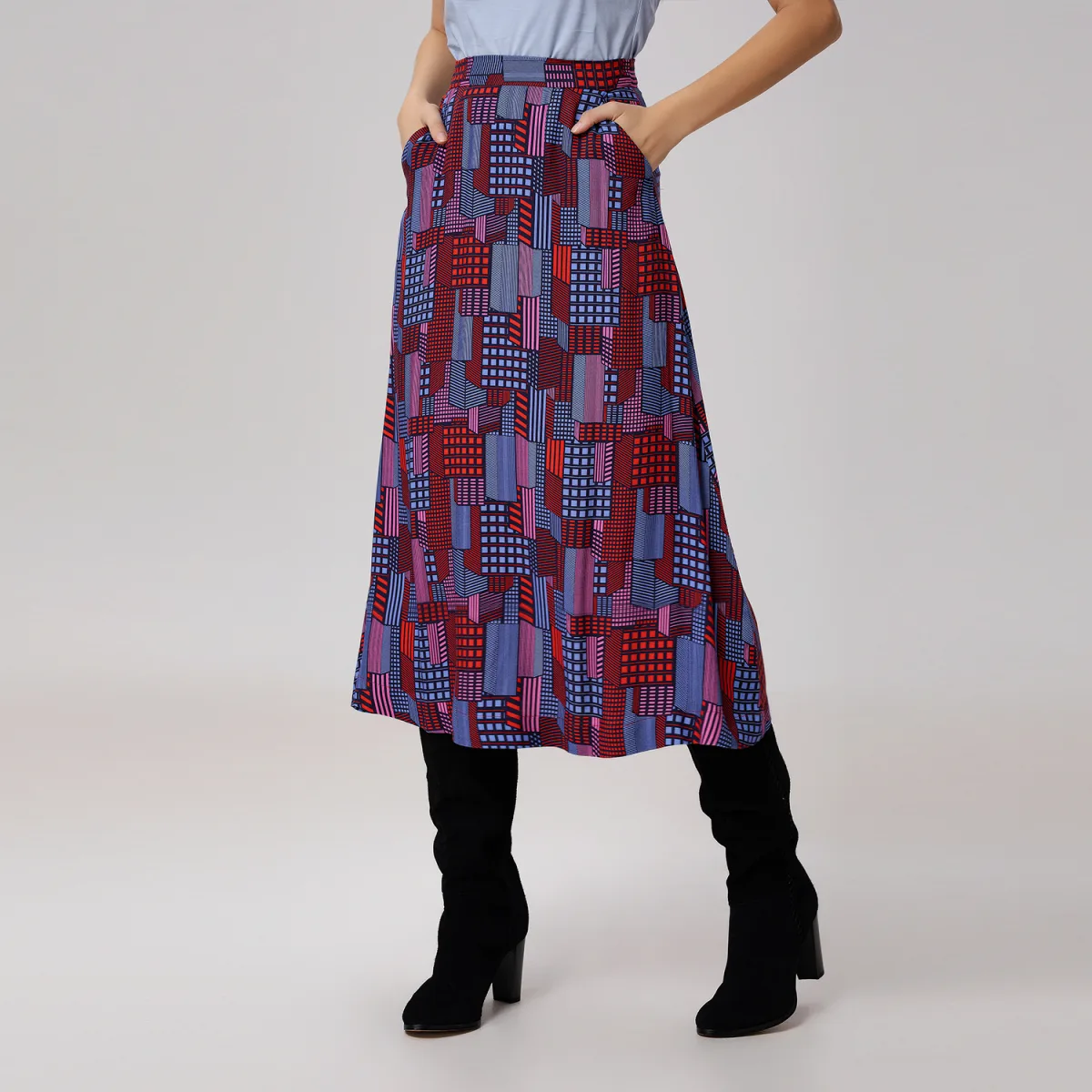 Een uitlopende rok die tot aan de kuiten valt en is gemaakt van zacht, soepel materiaal dat elegant valt. Een grafisch en vrouwelijk exemplaar met een geometrische patroonprint. Draag met blouses, overhemden, truien en blazers. Wordt halverwege het seizoen gedragen voor alledaagse gelegenheden, stadsgelegenheden of meer feestelijke dansevenementen. Productdetails: Vorm: trapezium, Lengte: 84cm Zijzakken Onzichtbare ritssluiting middenachter en knoop