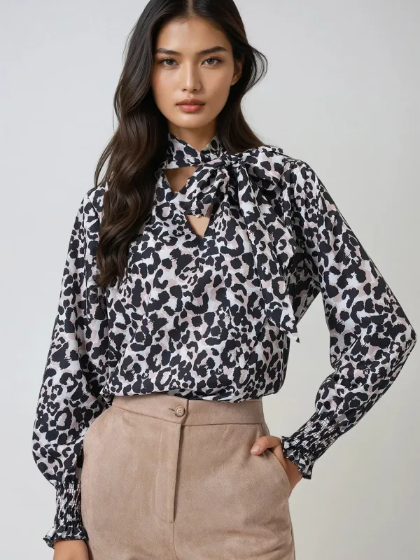 Blouse type: Blouseshirt; Design: Gevoerde zoom/rand, Om te knopen/binden; Motief: Dierenprint; Kraag: Strik; Details: Gedrapeerd; Extra's: All-over patroon, Gladde stof; Pasvorm: Normale pasvorm; Armlengte: Lange mouw; Lengte: Normale lengte