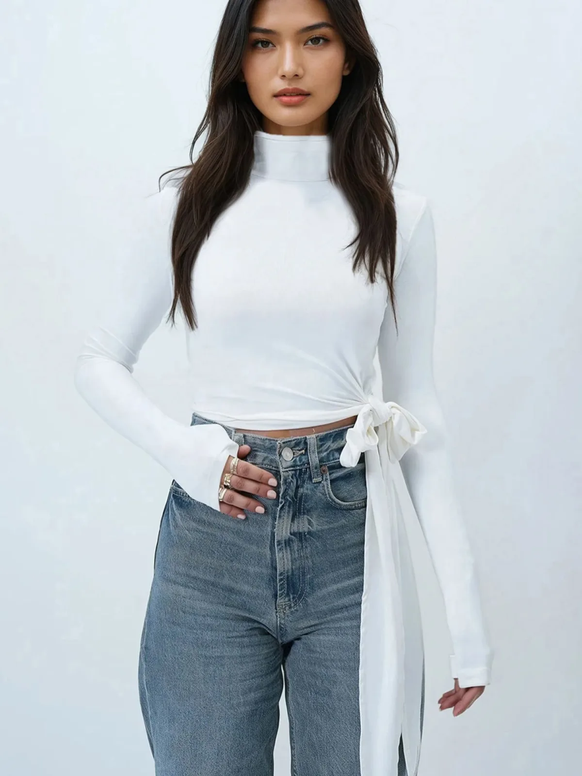 Blouse type: Blouseshirt; Design: Gevoerde zoom/rand, Duimopening; Motief: Effen; Kraag: Opstaande kraag; Details: Cut-outs, Gedrapeerd; Extra's: Applicaties, Op staal naden; Pasvorm: Slanke pasvorm; Armlengte: Lange mouw; Lengte: Korte pasvorm