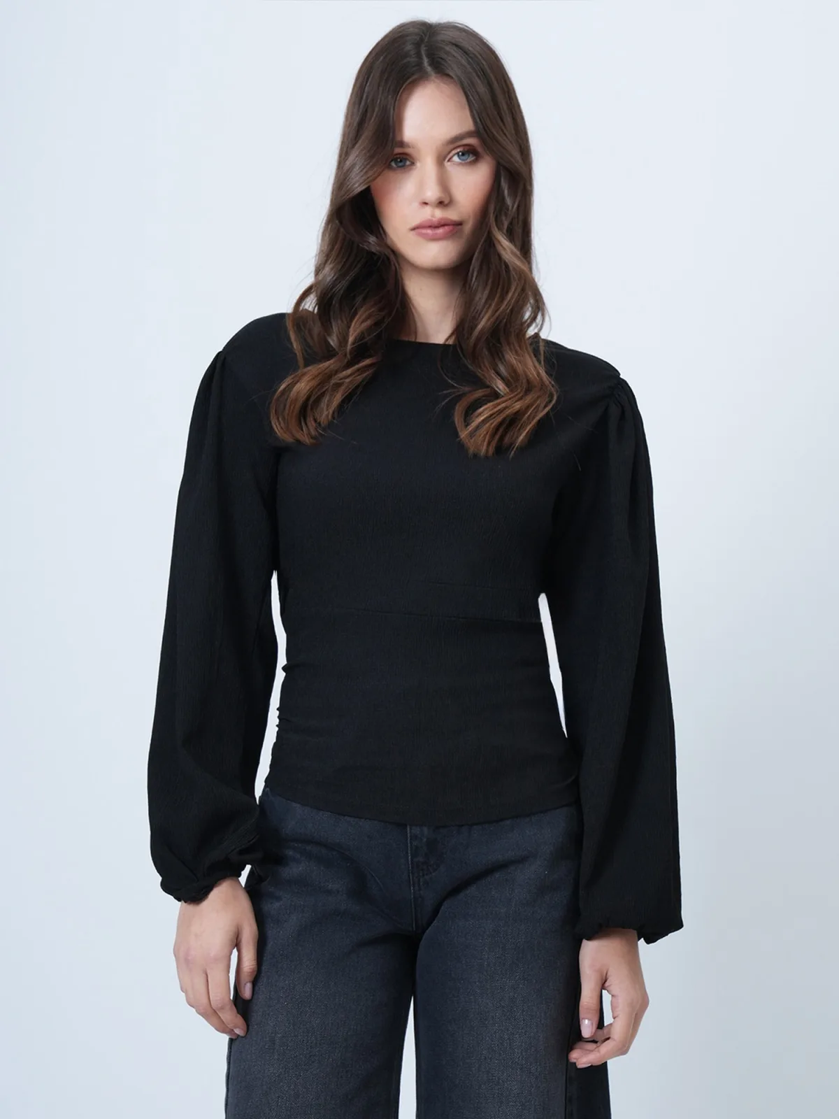 Blouse type: Blouseshirt; Design: Gevoerde zoom/rand, Pofmouwen; Motief: Effen; Kraag: Zonder kraag; Details: Gedrapeerd; Extra's: Op staal naden, Met textuur; Pasvorm: Aansluitende pasvorm; Armlengte: Lange mouw; Lengte: Normale lengte