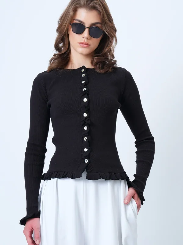 Design: Knop placket, Ingelegde kraag; Type sluiting: Knoopsluiting; Materiaal: Knitwear; Halstype: Ronde hals; Motief: Effen; Details: Ruches; Extra's: Op staal naden, Voelt zacht aan; Pasvorm: Slanke pasvorm; Armlengte: Lange mouw; Lengte: Normale lengte