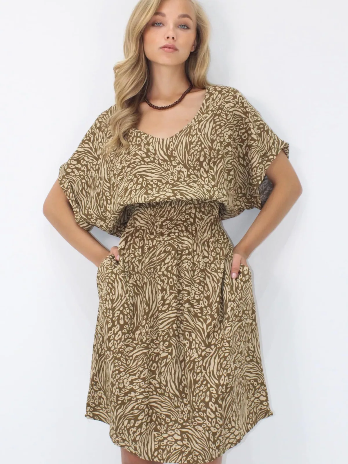 Design: Gevoerde zoom/rand, Flare; Type sluiting: Slip; Materiaal: Viscose; Halstype: Ronde hals; Soort bandjes: Brede bandjes; Details: Gedrapeerd; Extra's: All-over patroon, Lichte stof; Lengte: Knielengte; Snit: Getailleerd; Pasvorm: Normale pasvorm; Armlengte: Halve mouw
