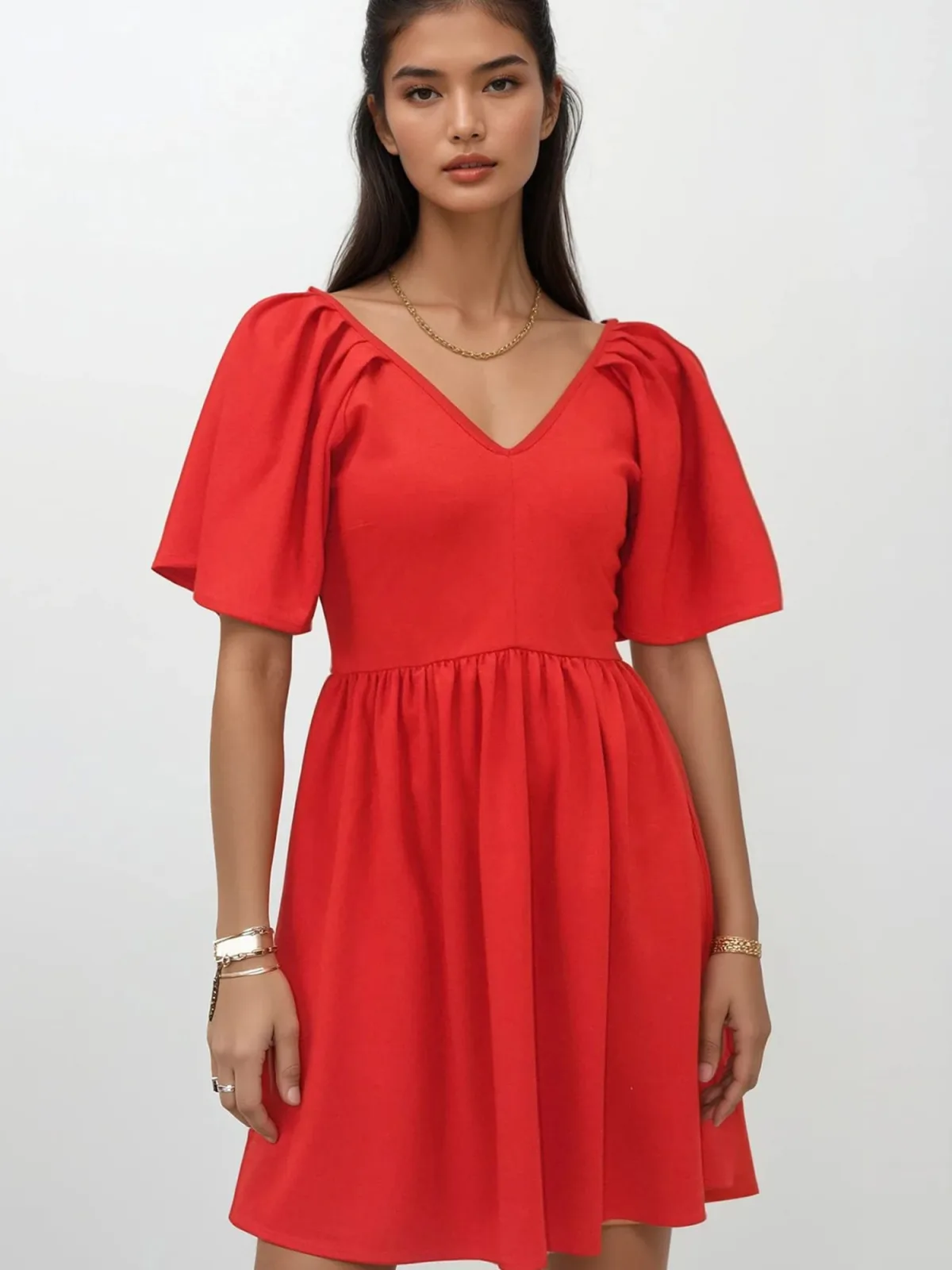 Design: Gevoerde zoom/rand, Pofmouwen, Diepe snit/decolleté, Ingelegde kraag; Materiaal: Katoen; Halstype: V-hals; Motief: Effen; Details: Gedrapeerd; Extra's: Op staal naden, Voelt zacht aan; Lengte: Knielengte; Snit: Getailleerd; Pasvorm: Normale pasvorm; Armlengte: Halve mouw