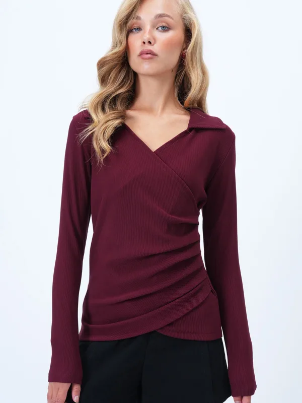 Blouse type: Klassieke blouse; Design: Gevoerde zoom/rand, Asymmetrische zoom, Turn-down kraag; Materiaal: Jersey; Halstype: V-hals; Motief: Effen; Details: Plooien, Wikkel design; Extra's: Op staal naden, Vaste grip; Pasvorm: Slanke pasvorm; Armlengte: Lange mouw; Lengte: Normale lengte