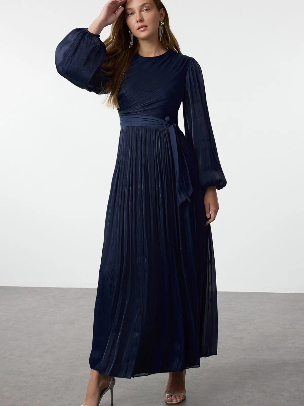 Design: Gevoerde zoom/rand, Pofmouwen, Rug rits, Tailleriem; Type sluiting: Ritssluiting; Halstype: Ronde hals; Motief: Effen; Details: Gedrapeerd, Plissé; Extra's: Op staal naden, Voelt zacht aan; Lengte: Lang/maxi; Snit: Getailleerd; Pasvorm: Slanke pasvorm; Armlengte: Lange mouw