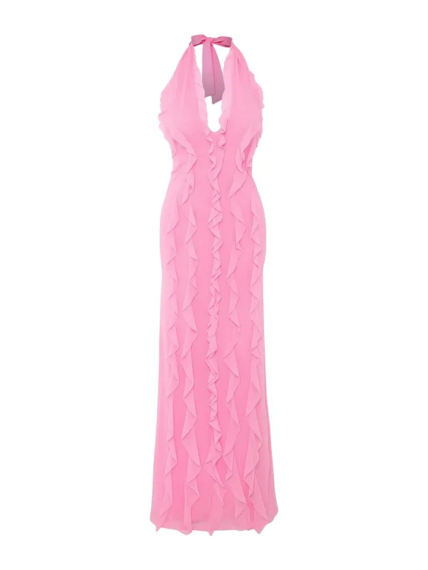 Design: Met onderjurk, Diepe snit/decolleté, Om te knopen/binden, Uitgesneden rug; Halstype: V-hals; Motief: Effen; Soort bandjes: Haltermodel; Details: Ruches, Backless; Extra's: Op staal naden, Voelt zacht aan; Lengte: Lang/maxi; Snit: Getailleerd; Pasvorm: Slanke pasvorm; Armlengte: Mouwloos