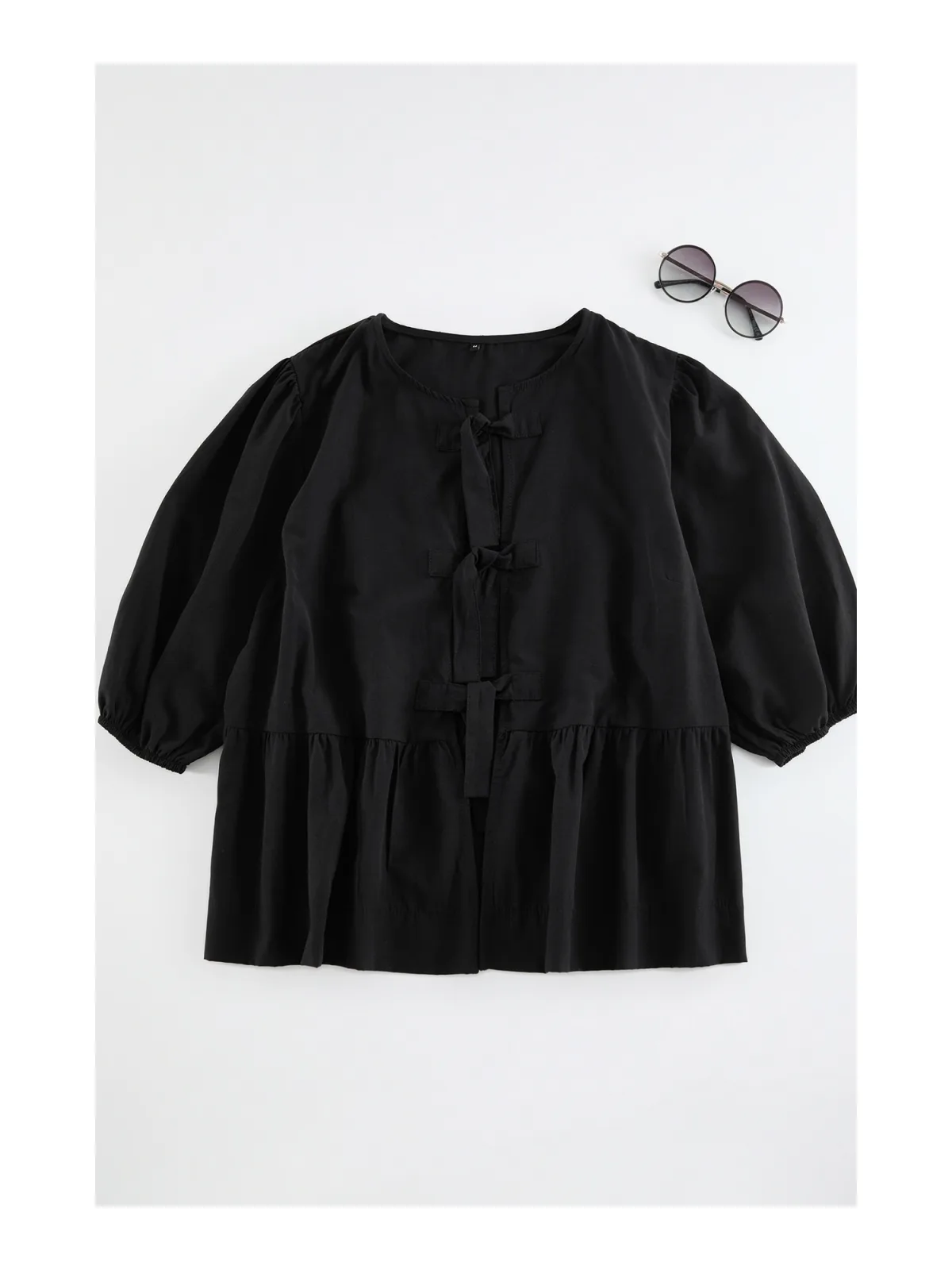Blouse type: Klassieke blouse; Design: Pofmouwen, Om te knopen/binden; Motief: Effen; Kraag: Zonder kraag; Details: Volant, Gedrapeerd; Extra's: Op staal naden, Gladde stof; Pasvorm: Normale pasvorm; Armlengte: Halve mouw; Lengte: Normale lengte