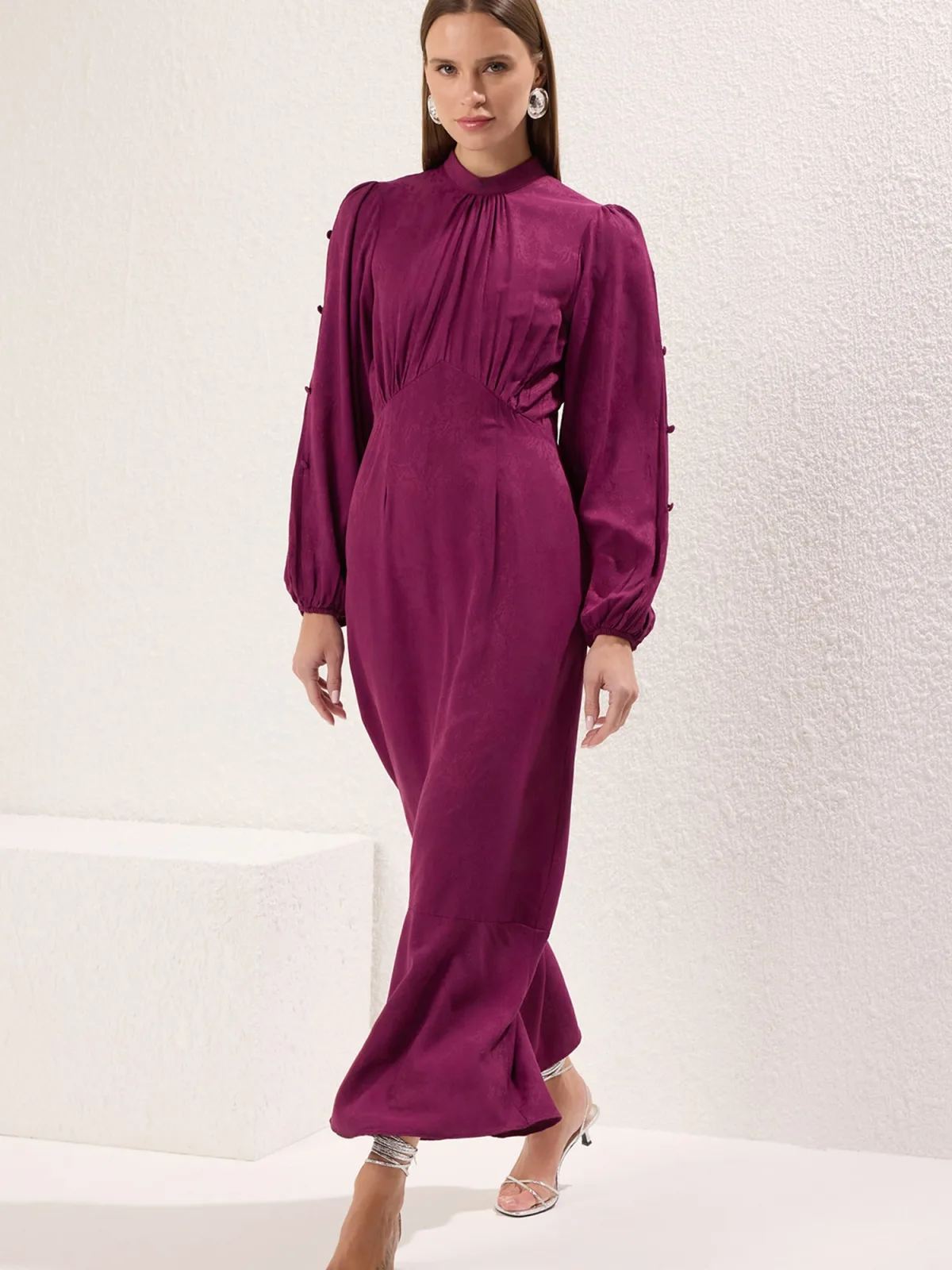 Design: Gevoerde zoom/rand, Pofmouwen, Elastische inzetstukken, Gevoerde rug; Type sluiting: Ritssluiting; Materiaal: Viscose; Halstype: Opstaande kraag; Motief: Effen; Details: Volant, Gedrapeerd; Extra's: Op staal naden, Gladde stof, Voelt zacht aan; Lengte: 7/8 lengte; Snit: Getailleerd; Pasvorm: Normale pasvorm; Armlengte: Lange mouw